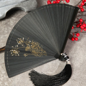 Black bamboo fan with gold floral design on wooden stand. Elegant Hanfu accessory with black tassel for traditional dance.