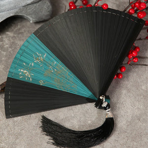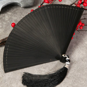 Compact black bamboo fan with black tassel, folded for easy storage. Ideal accessory for Chinese Hanfu dance performances.