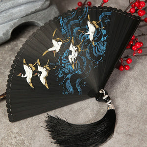 Black folding fan with crane and wave design, ideal for Hanfu dance. Full bamboo structure with black tassel for traditional Chinese style.