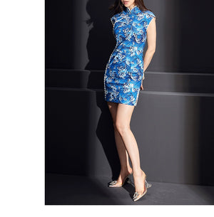 Hot stamping printing ukiyo-e painting wave blue short cheongsam