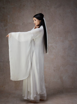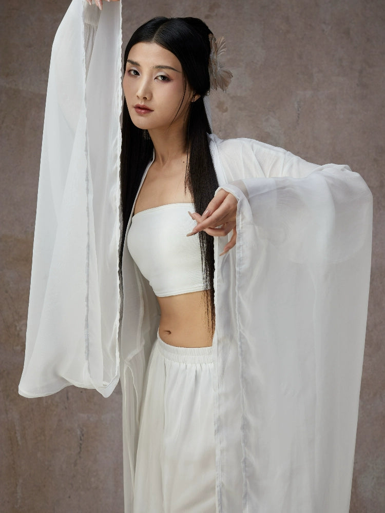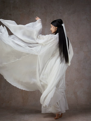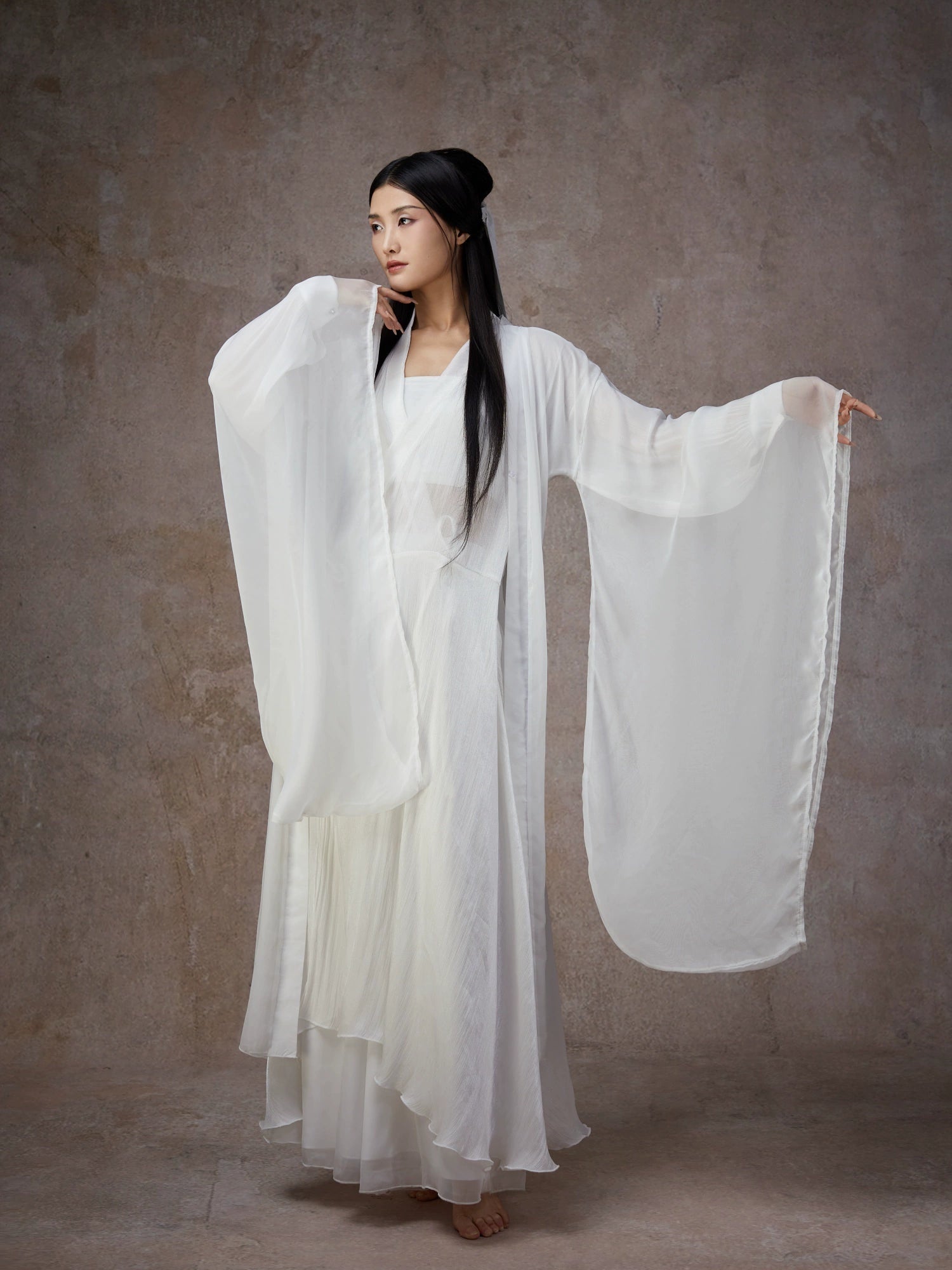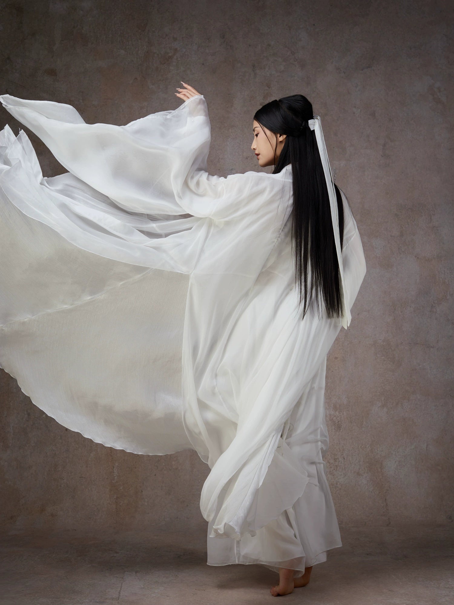 Graceful White Wide-Sleeve Chiffon Hanfu – Classical & Jazz Fusion Dance Dress