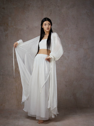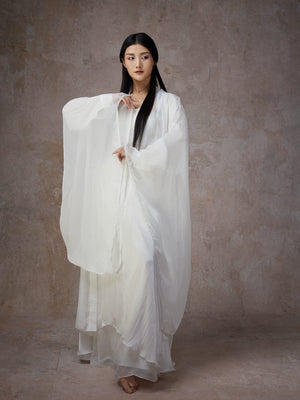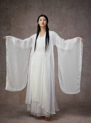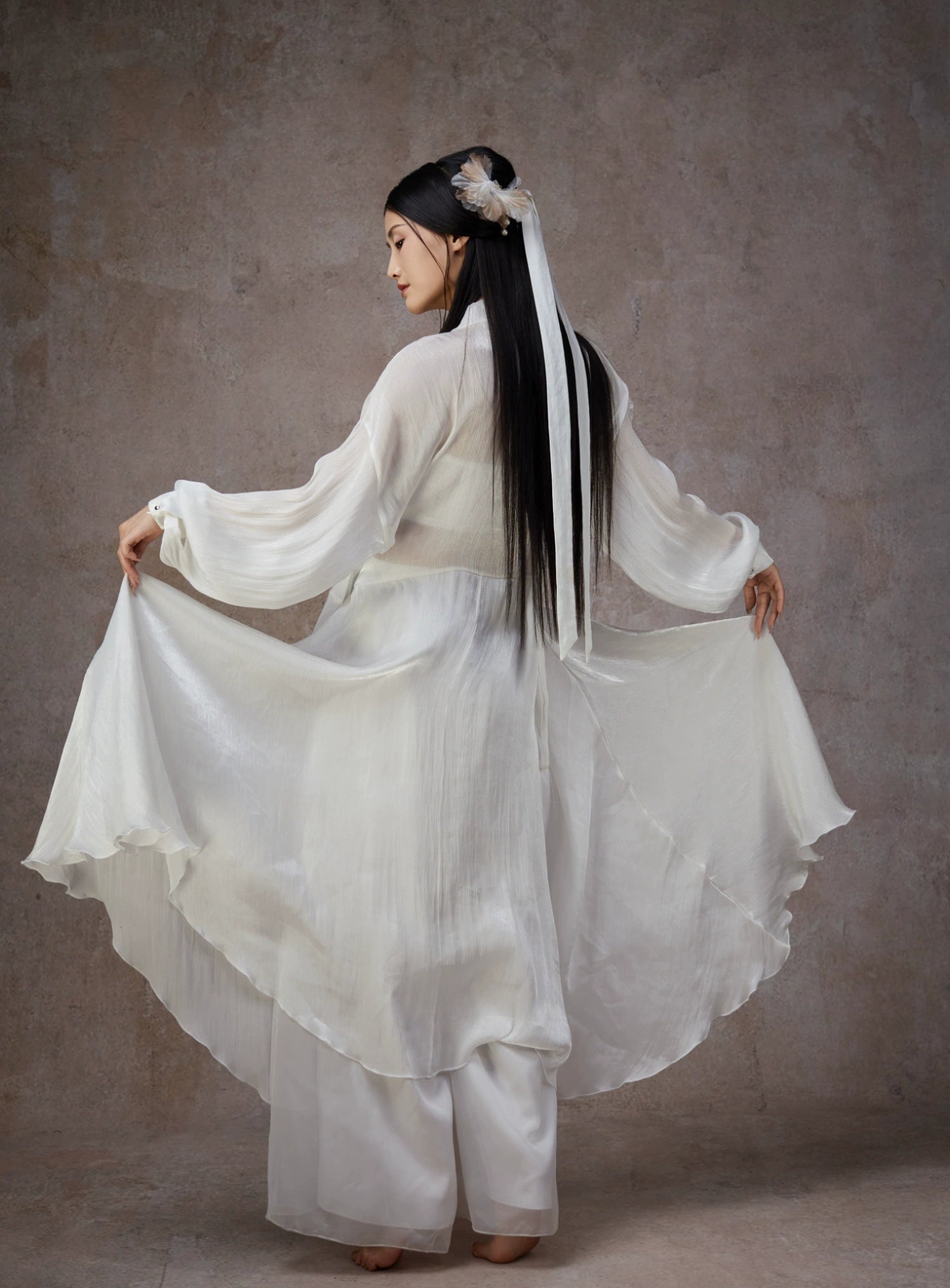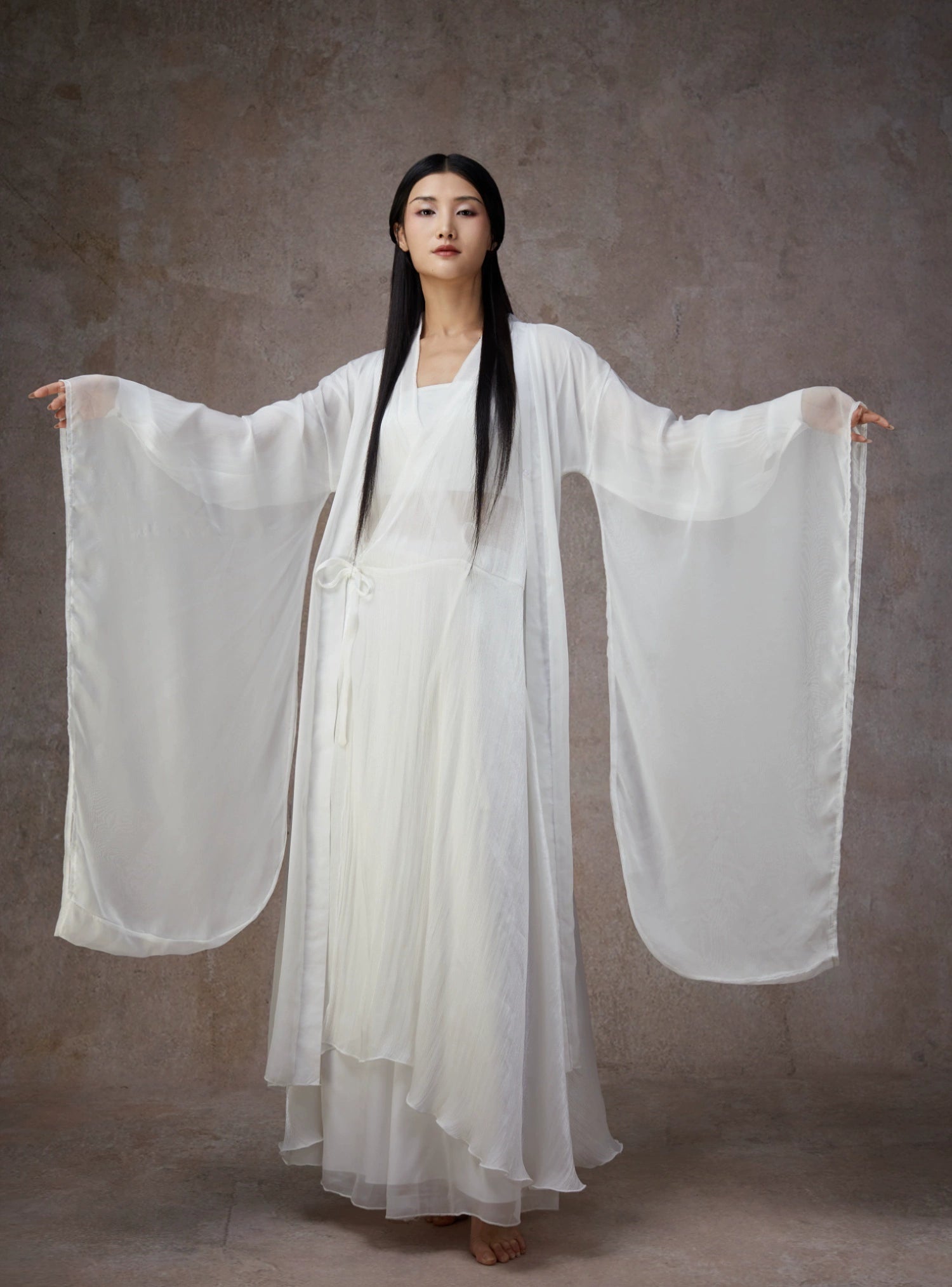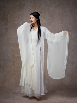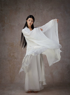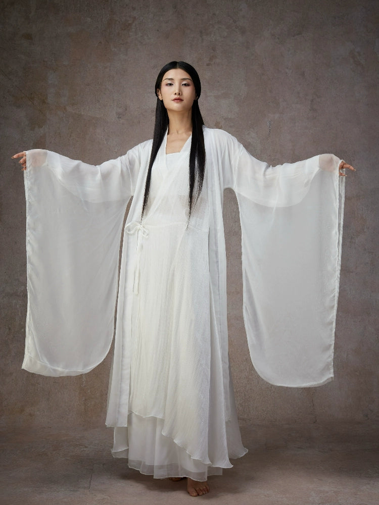 Graceful White Wide-Sleeve Chiffon Hanfu – Classical & Jazz Fusion Dance Dress
