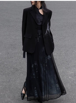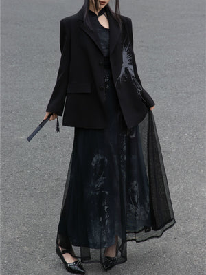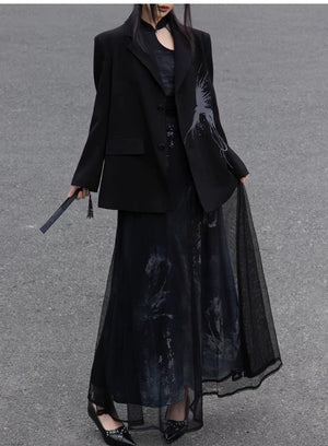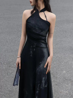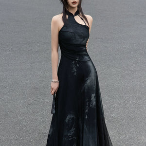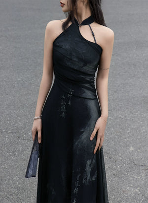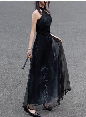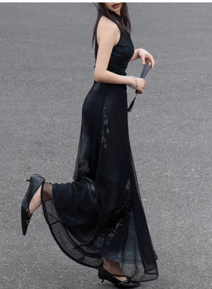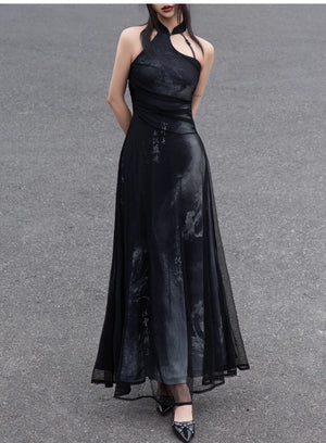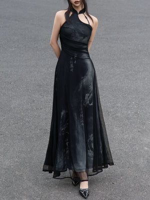 Iris Shadow – Sleeveless Grey Ombre Qipao | New Chinese Style Knitted A-Line Maxi Dress