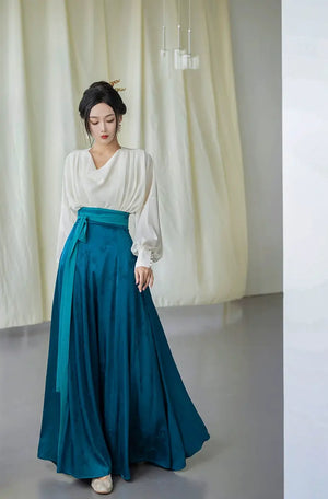 Blue collar shirt versatile beige top, lantern sleeve retro horse skirt
