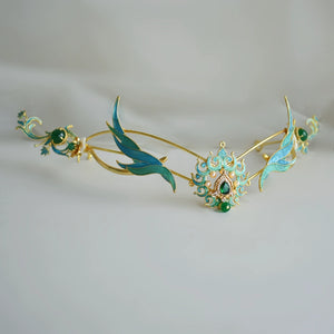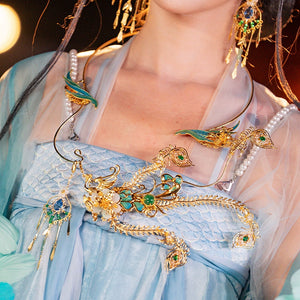 Song of the Peacock Plume – Gold-Plated Hanfu Headdress Set with Tassels & Crown Ornament