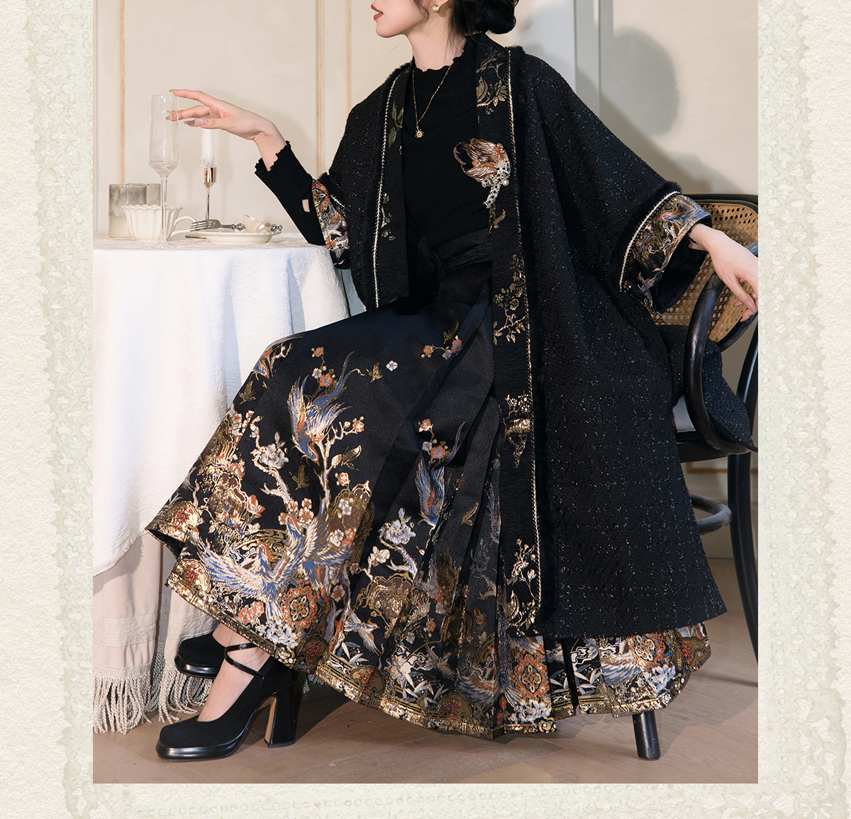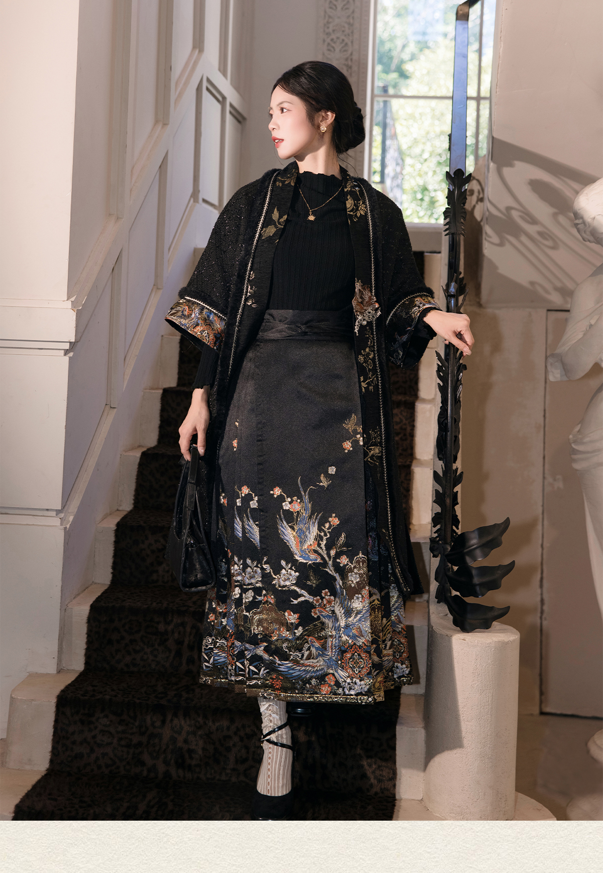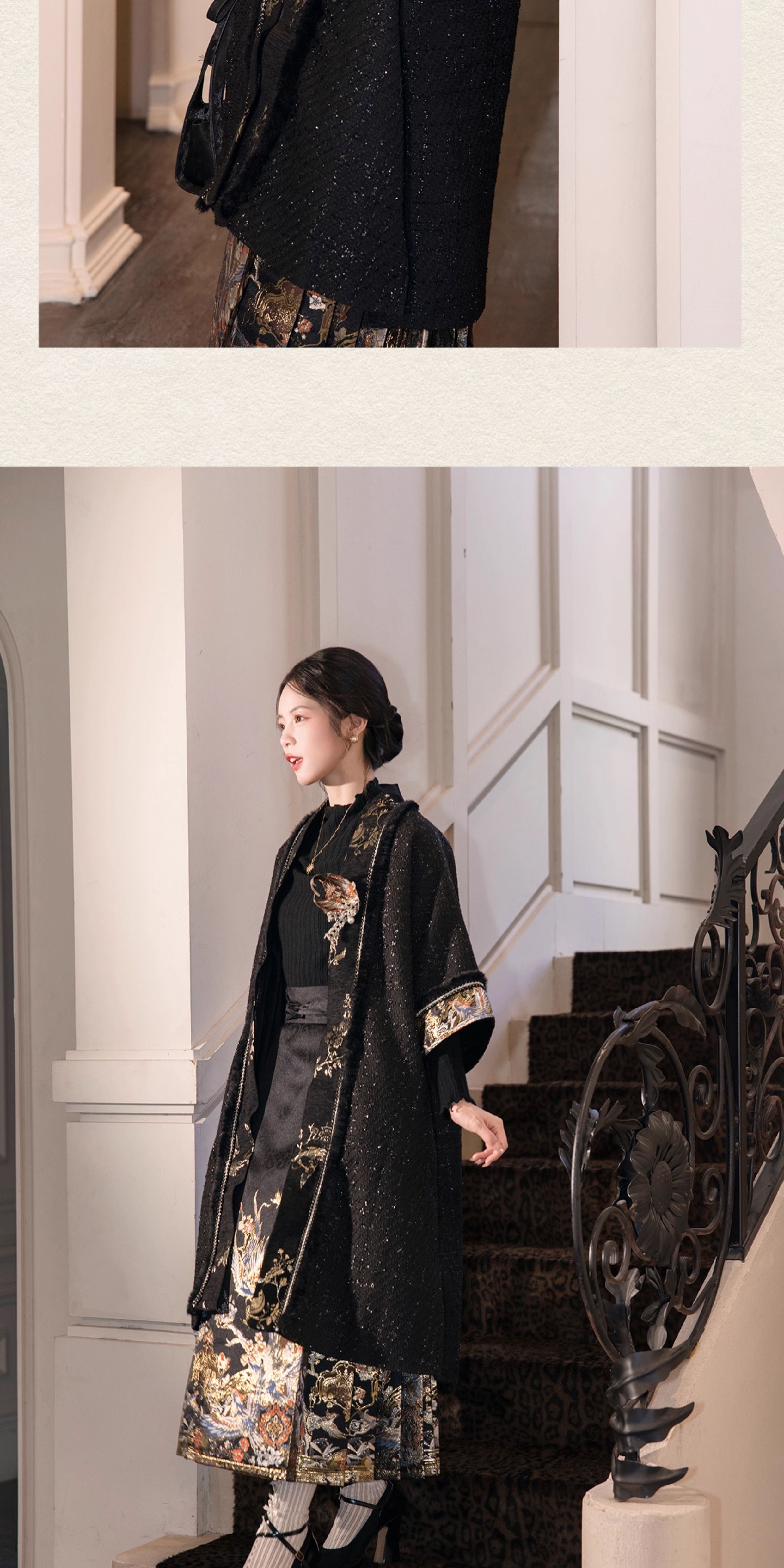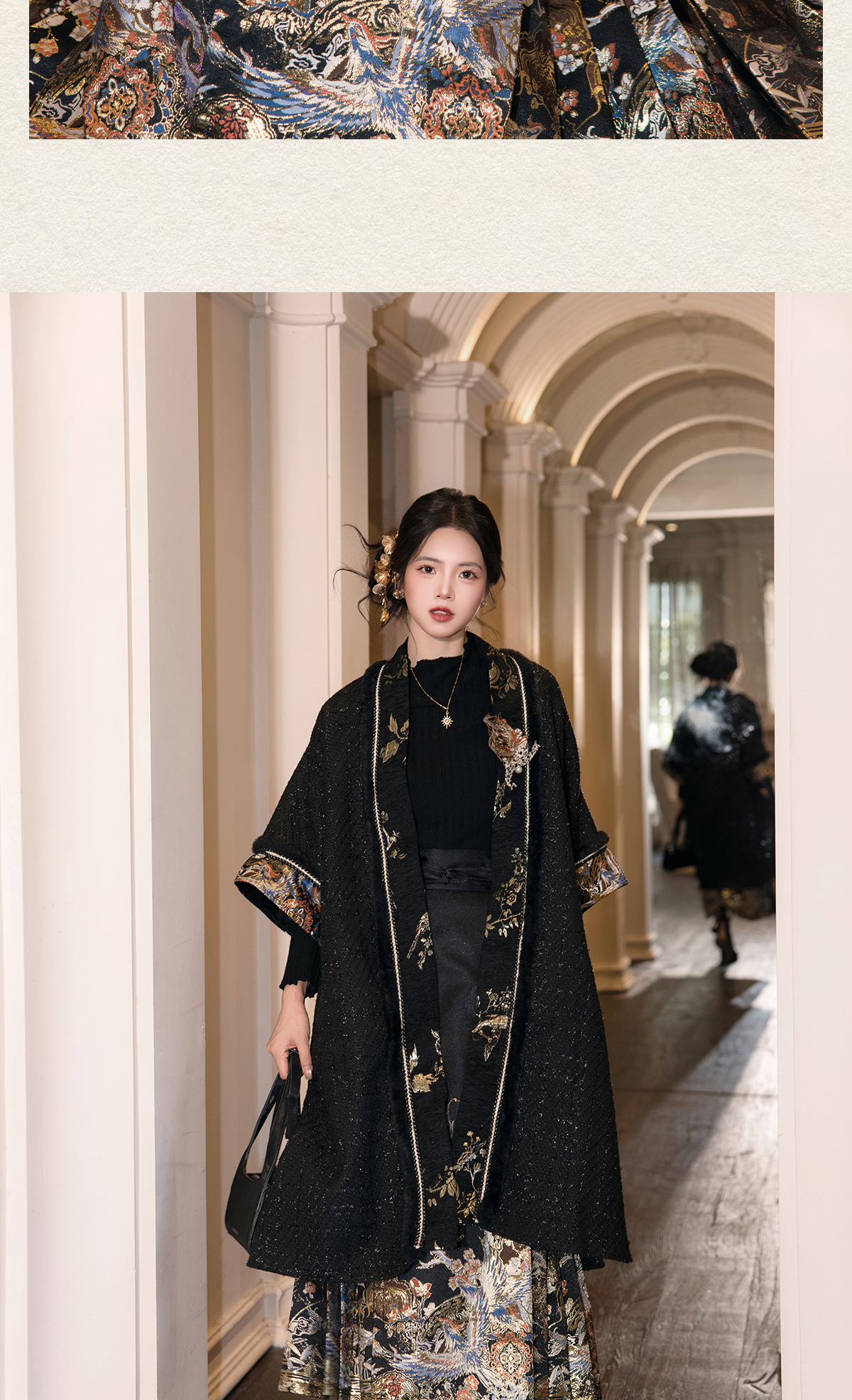 Spring Mountain Dragon – New Chinese Style Hanfu Set | Brocade Ma Mian Skirt with Embroidered Cape and Floral Gold Weave