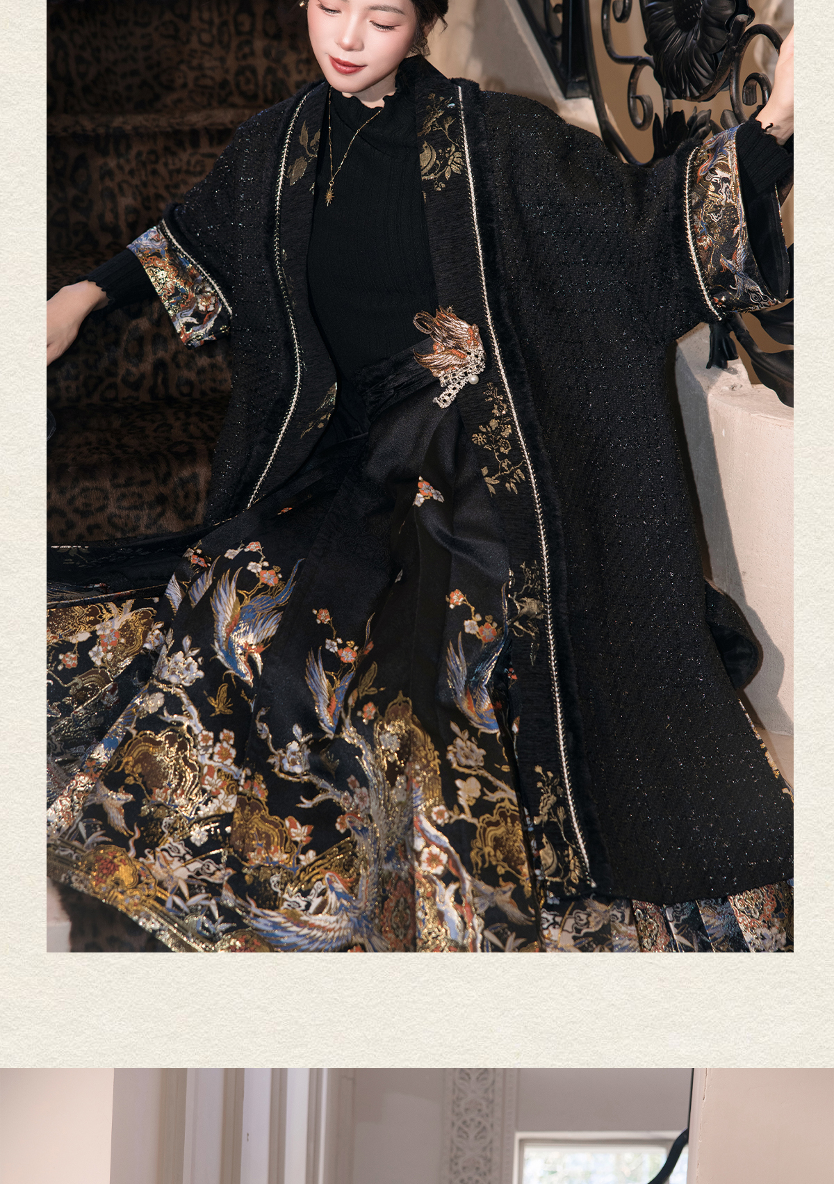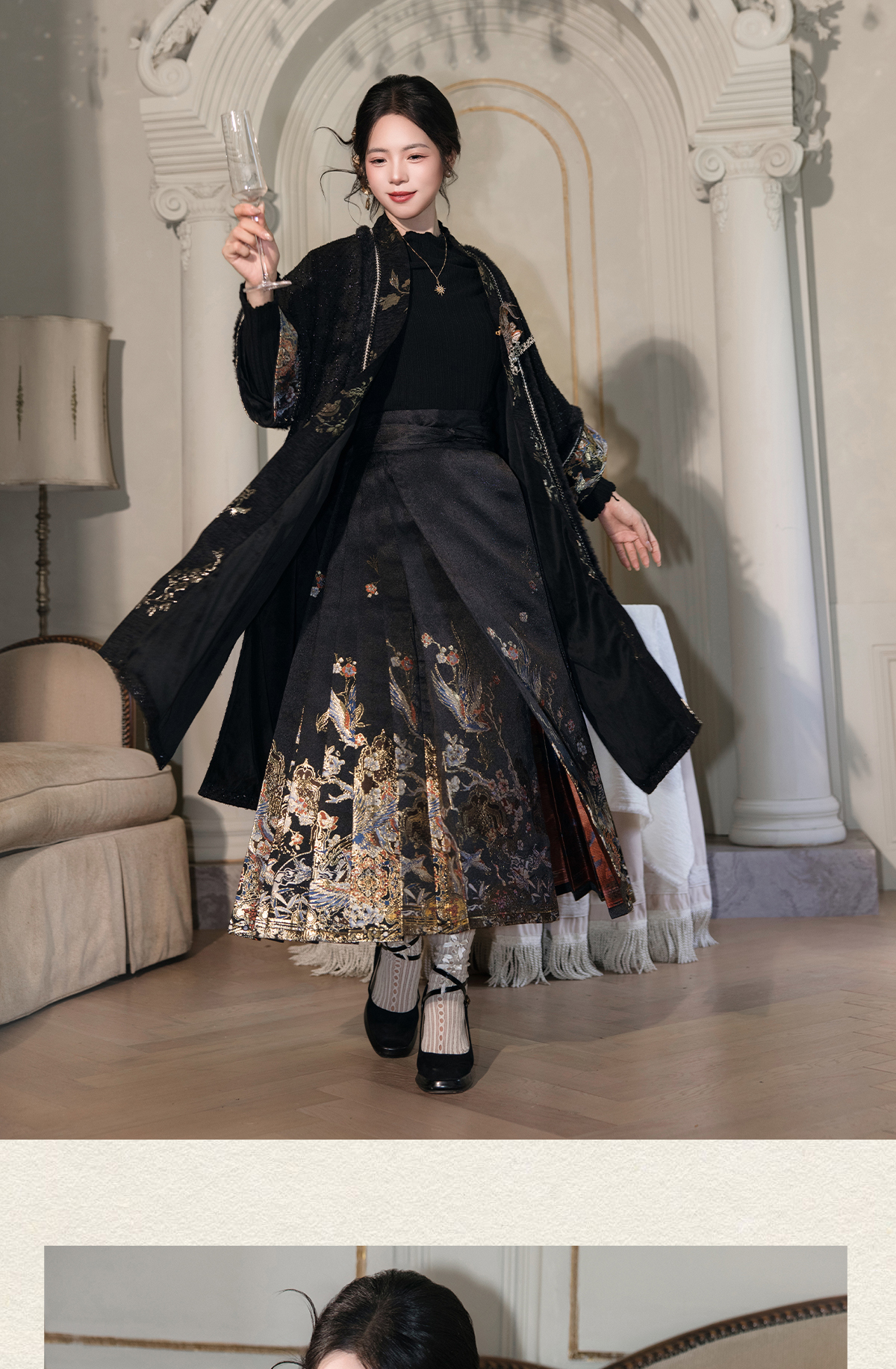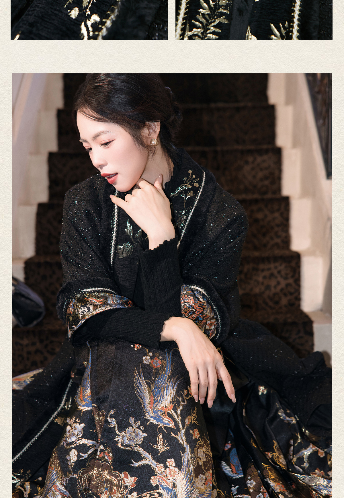 Spring Mountain Dragon – New Chinese Style Hanfu Set | Brocade Ma Mian Skirt with Embroidered Cape and Floral Gold Weave