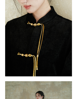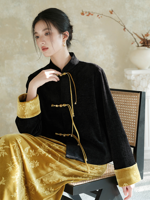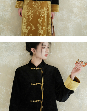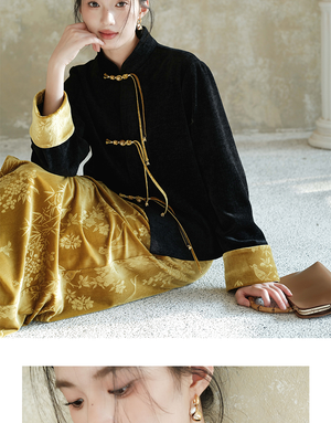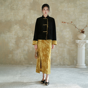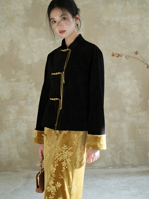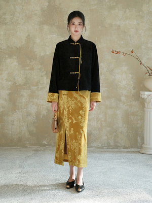 Velvet Elegance – Modern Chinese Women's Set | Black Embossed Tang-Style Jacket with Gold Skirt