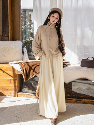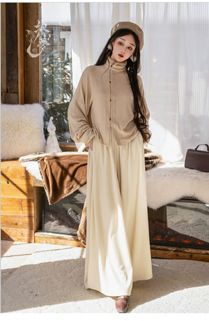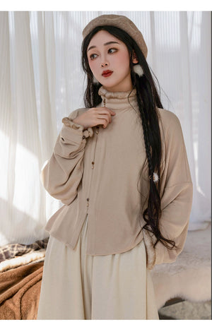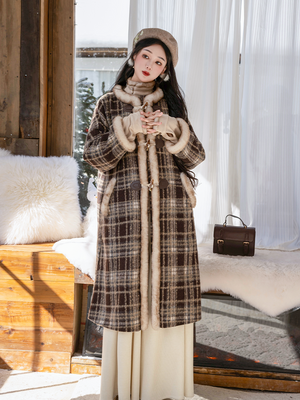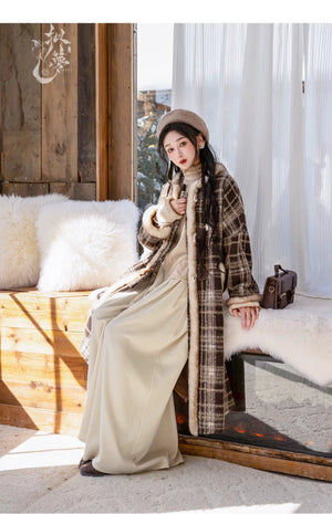 Home Amber Grace – Modern Hanfu Women's Autumn/Winter Set | Ming-Style Round-Collar Wool Coat with Plaid Song-Inspired Pants