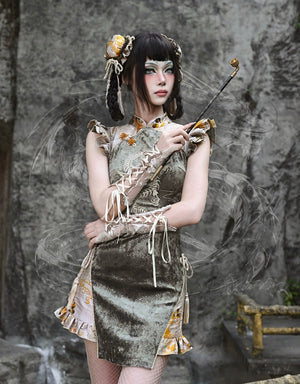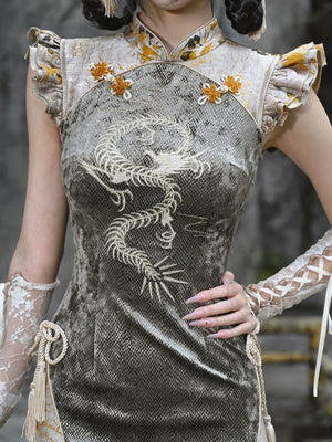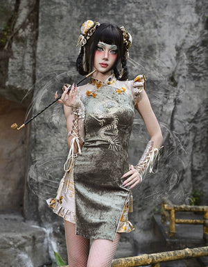 Short embroidered cheongsam dress with dragon design, featuring lace sleeves and floral accents, ideal for Halloween or Spring Dragon Festival.