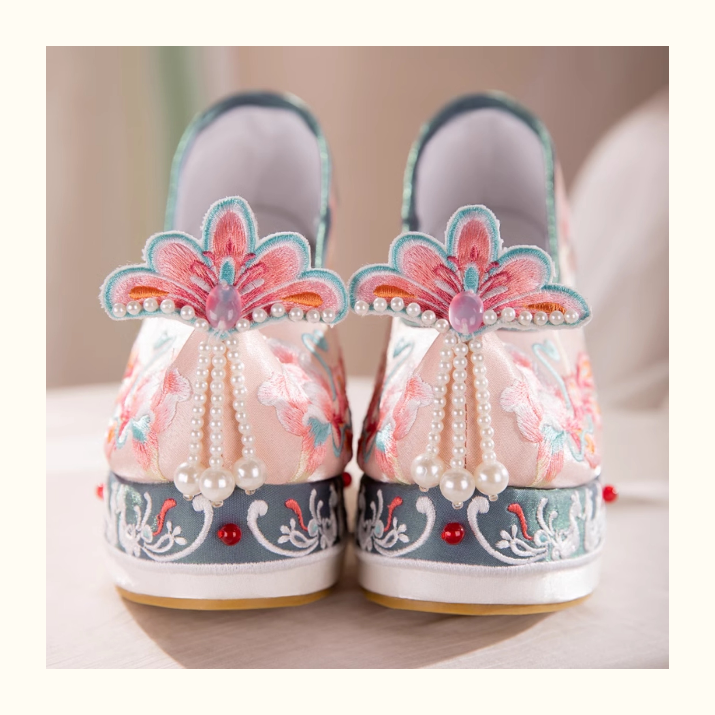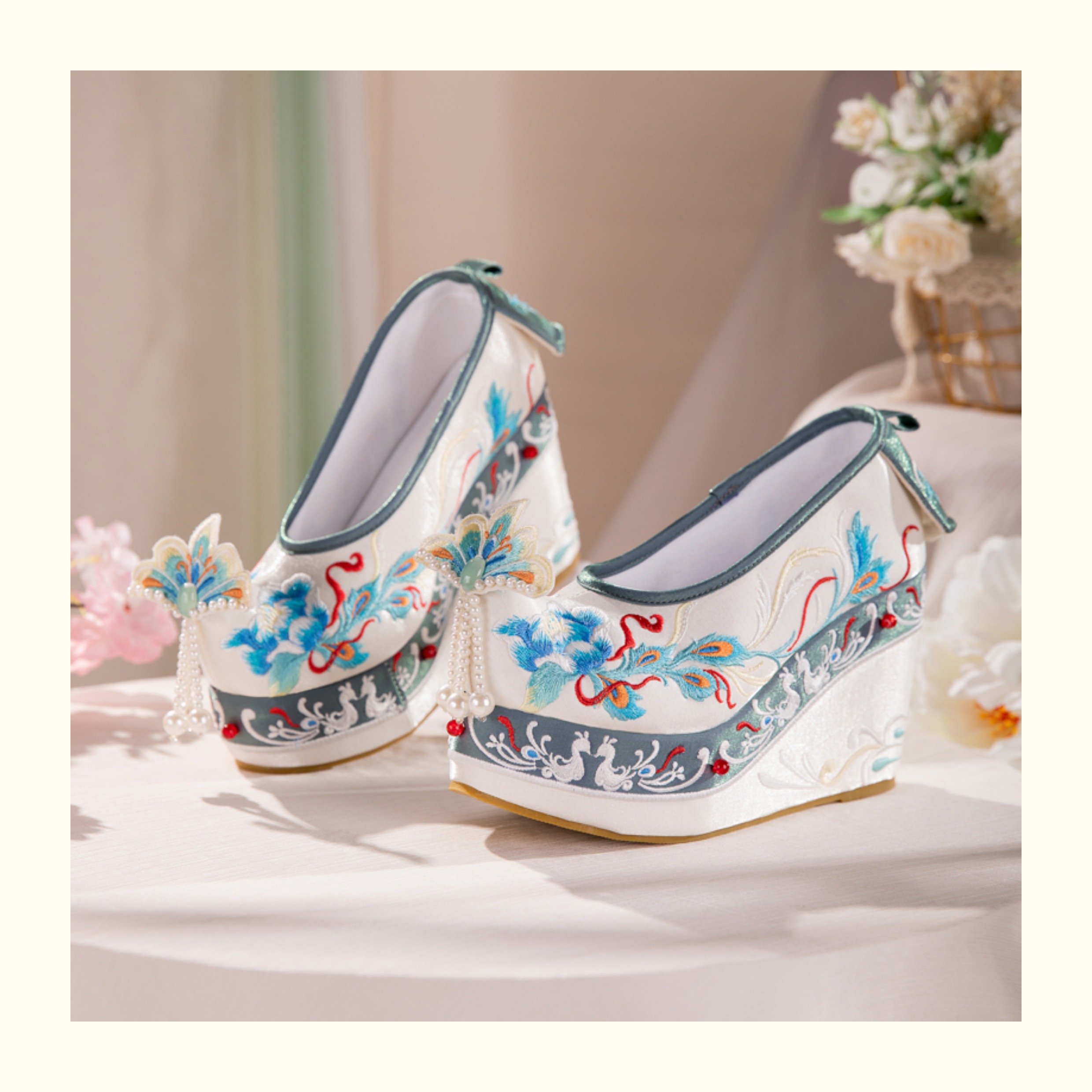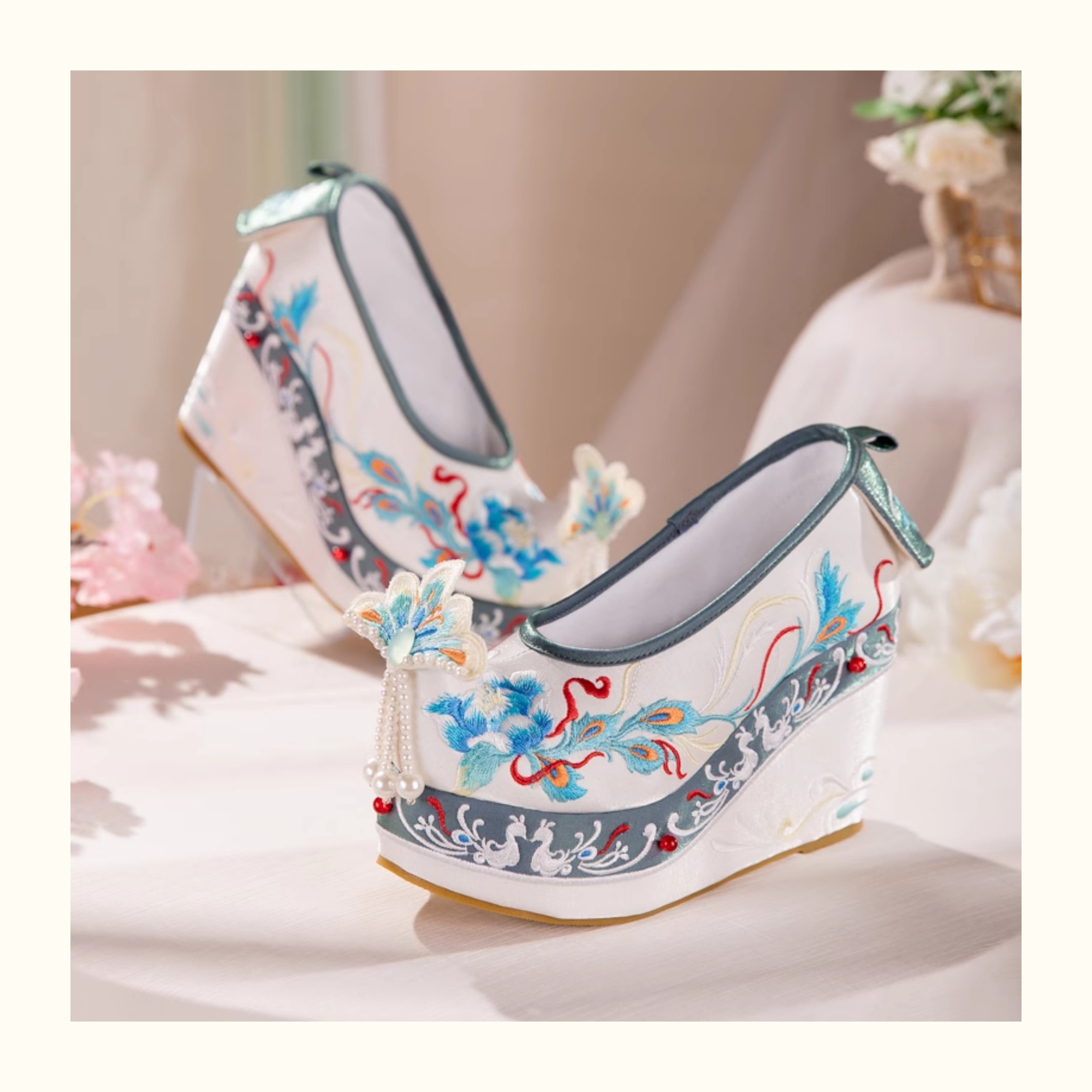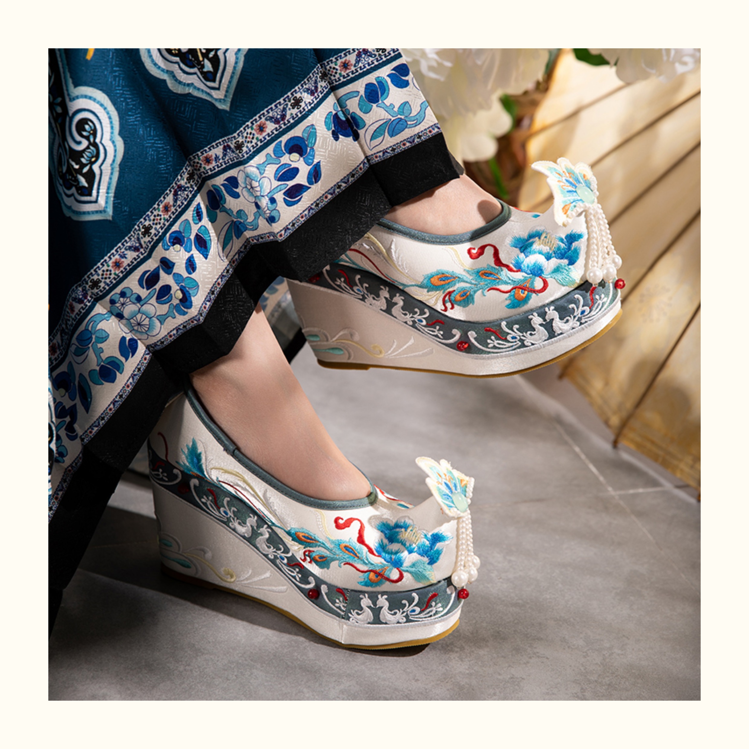 Blue Hanfu Embroidered Shoes – Women's Tang-Style Cloud-Toe Flats with 10cm Lift for Spring & Autumn