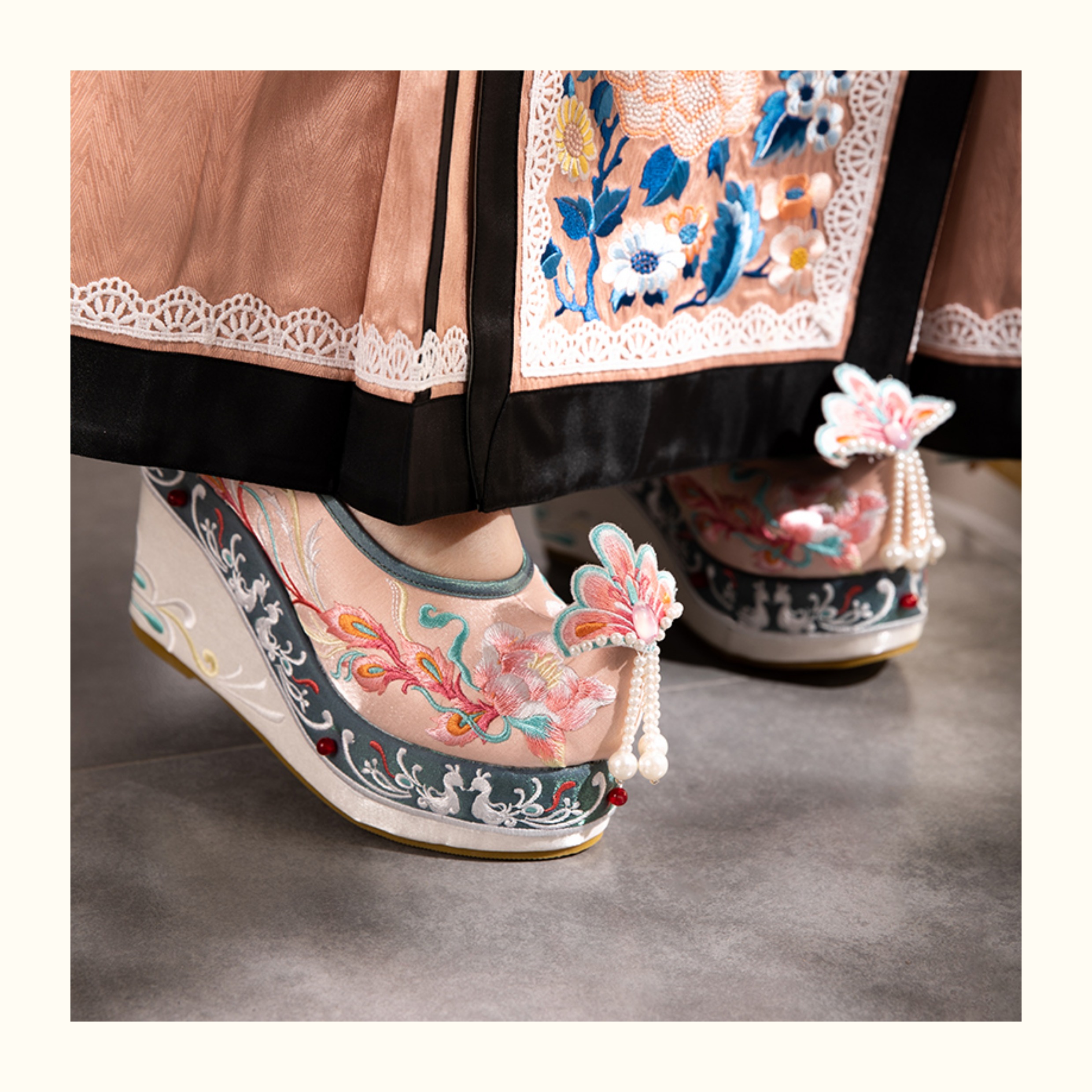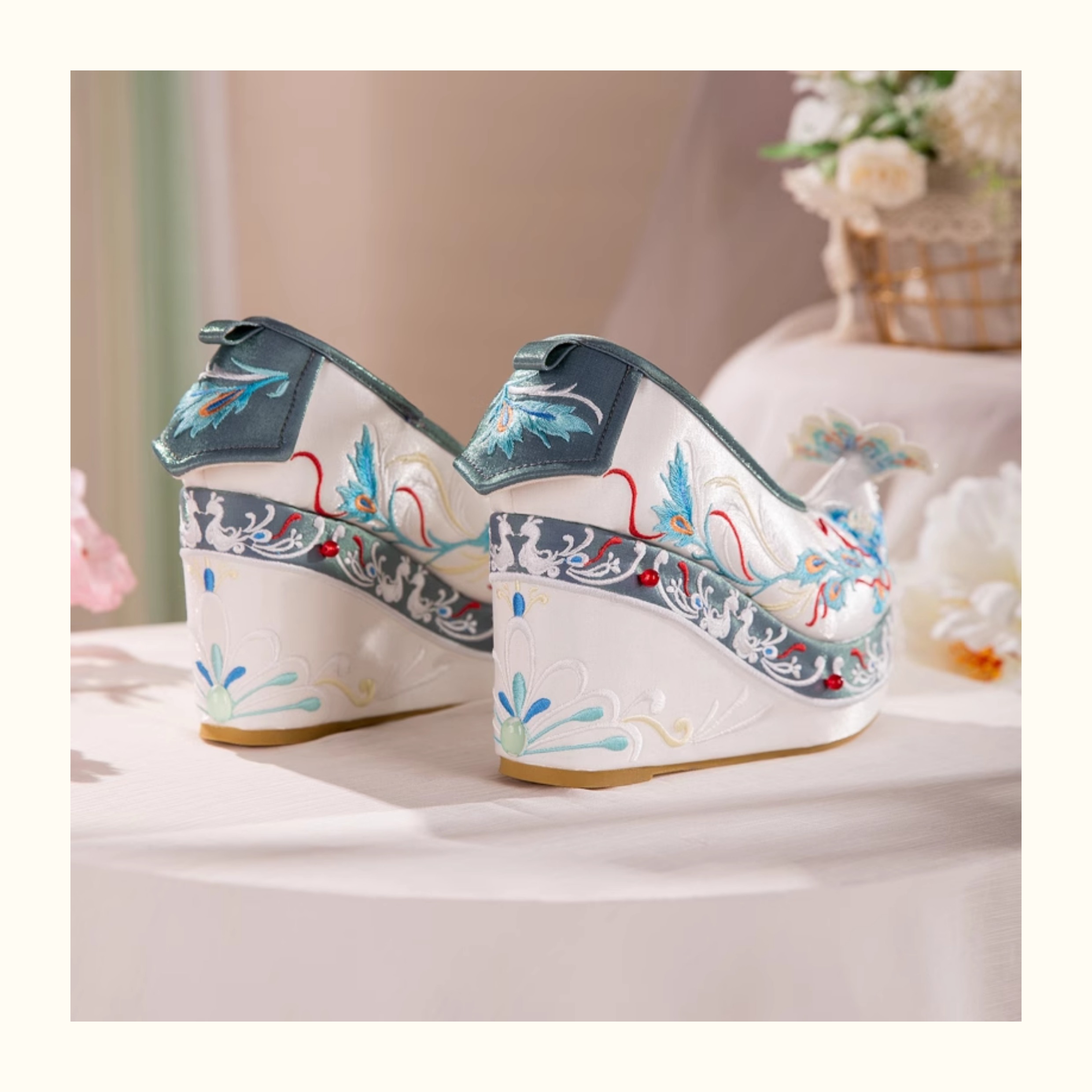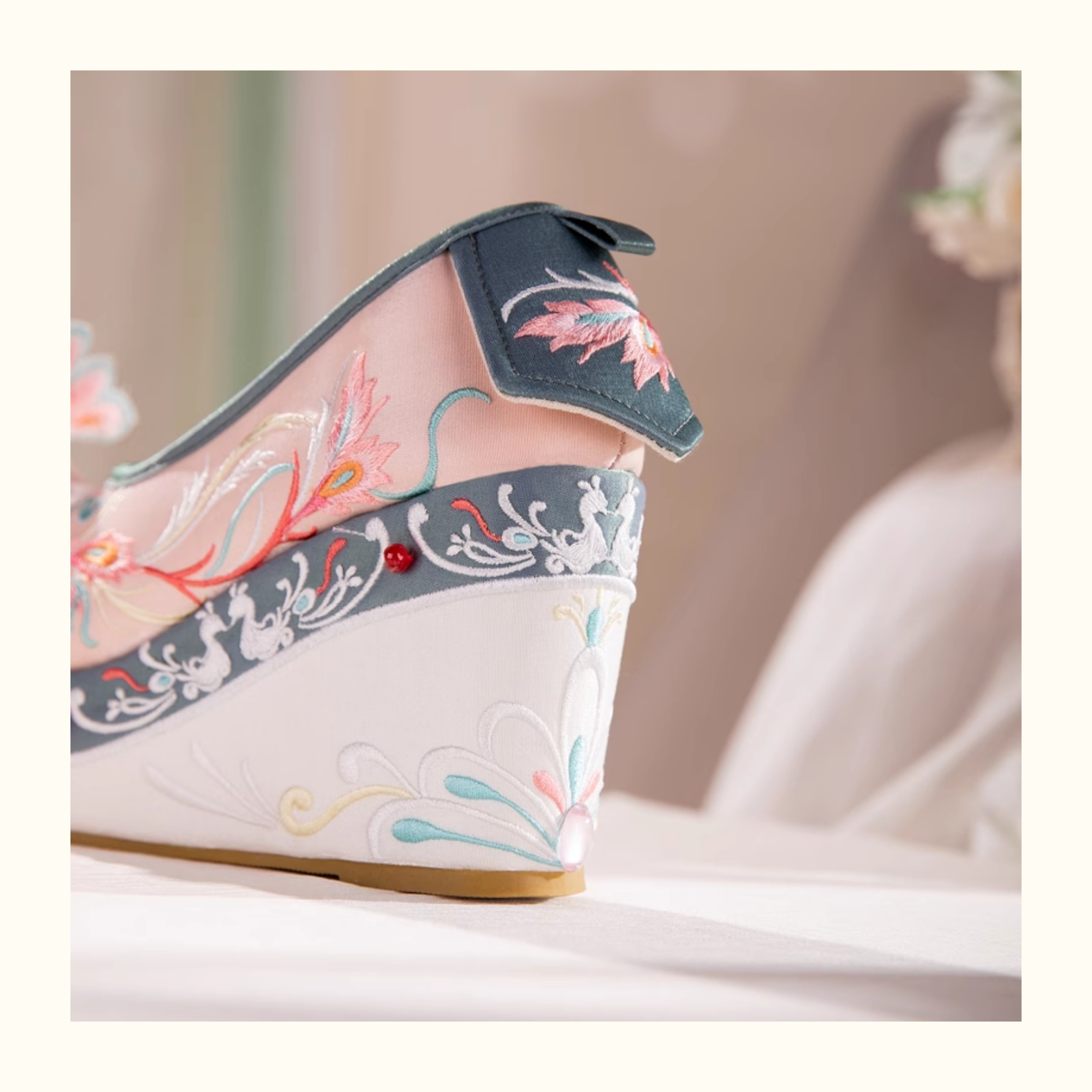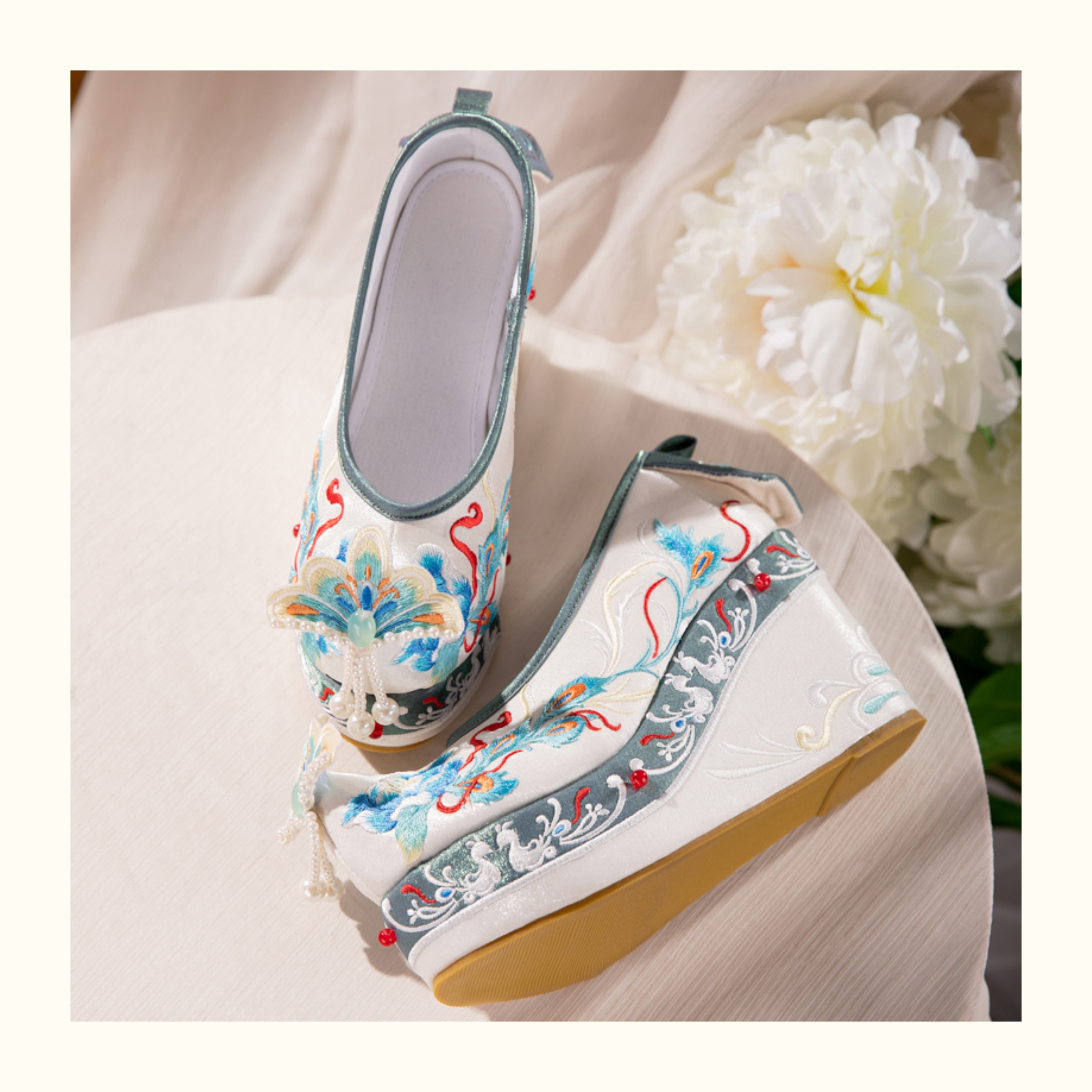 Blue Hanfu Embroidered Shoes – Women's Tang-Style Cloud-Toe Flats with 10cm Lift for Spring & Autumn