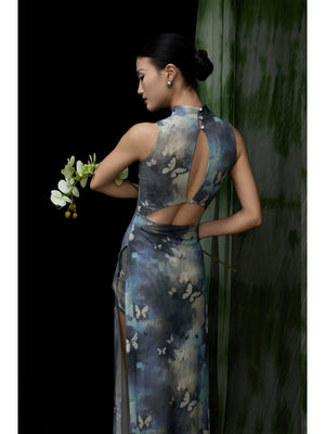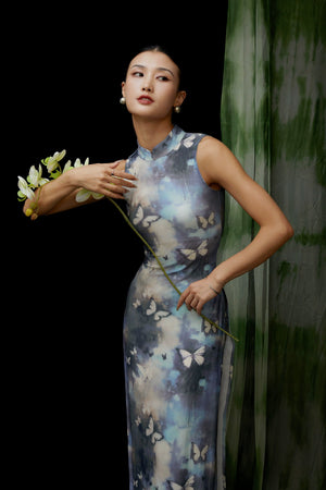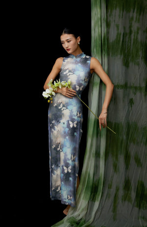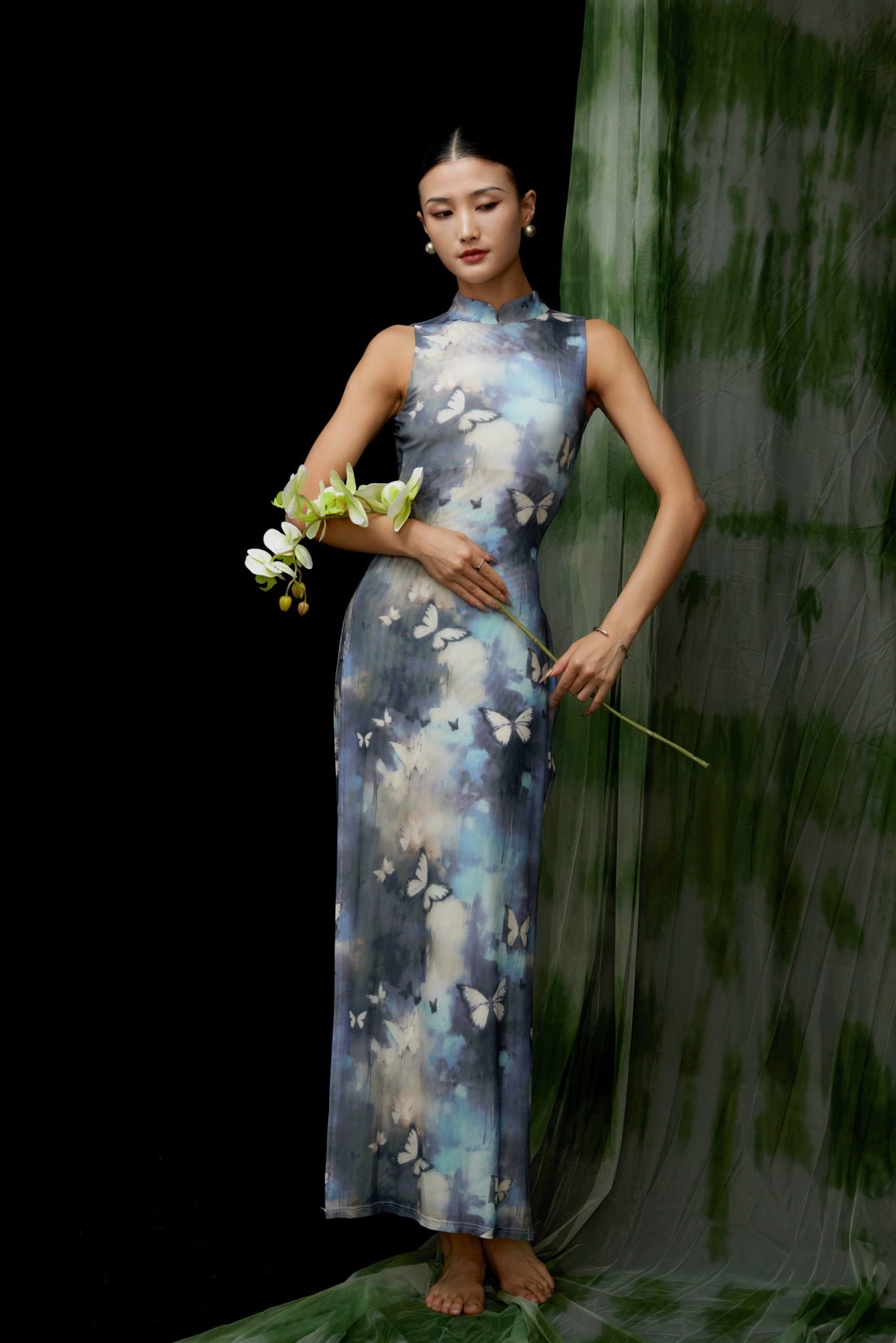 Elegant Modern Chinese-Style Blue Qipao Dress – Vintage-Inspired Long Cheongsam