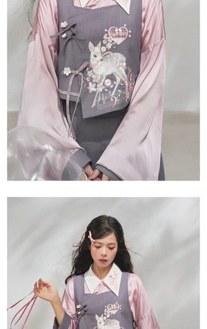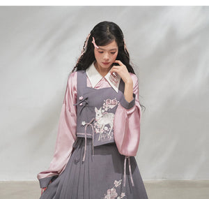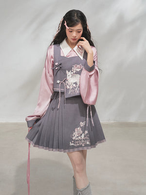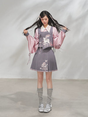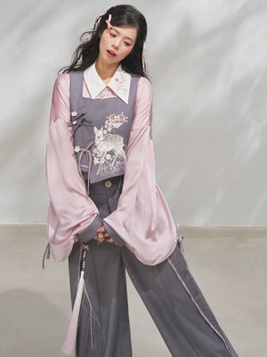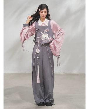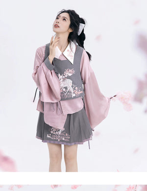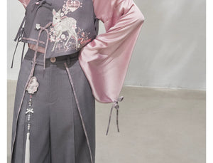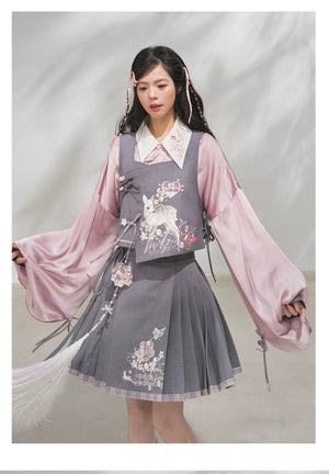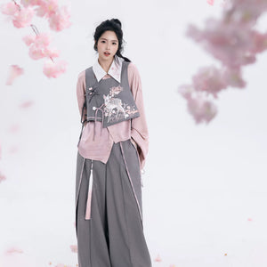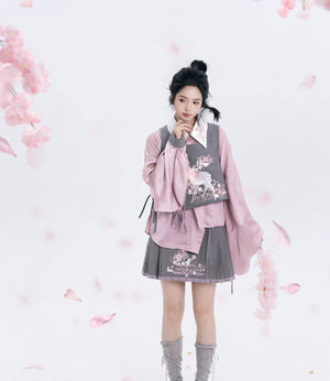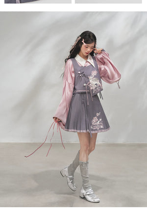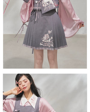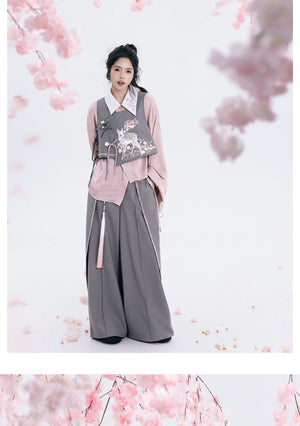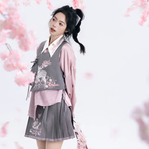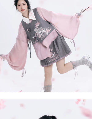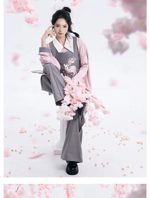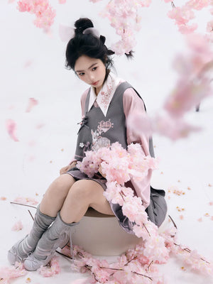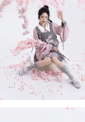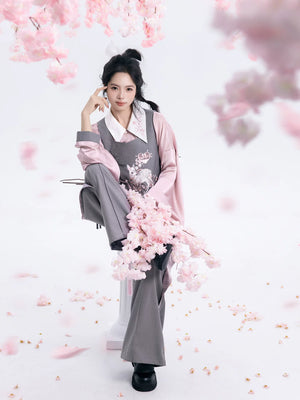 Discover the Grey-Toned Cherry Rhythm collection — a sophisticated spring Hanfu set that blends traditional Han element aesthetics with modern silhouettes. Featuring a delicate pipa-sleeve top, embroidered bijia vest, wide-leg pants, and a pleated short skirt, this versatile set can be styled multiple ways for a refined, contemporary Guofeng look.