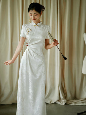 "Kite Butterfly" White Jacquard Cheongsam Bridal Toast Dress Engagement Dress