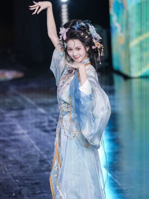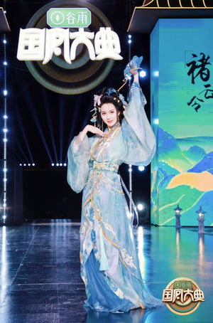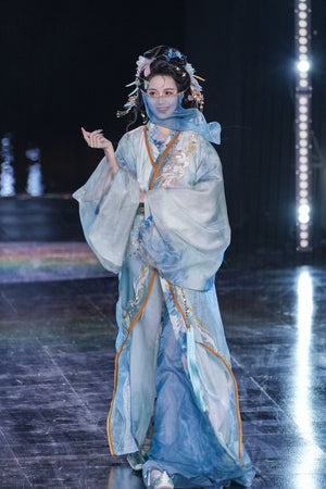 "Listening to Rain in the Misty Mountains" – Ombre Embroidered Hanfu Robe | Showpiece Inspired by the Warring States