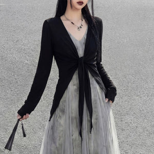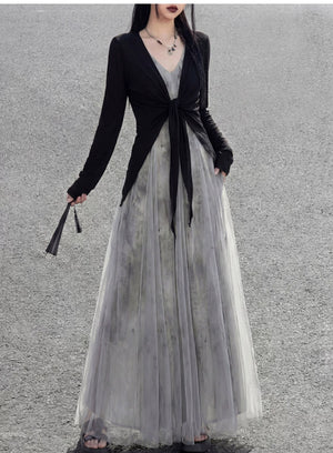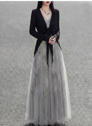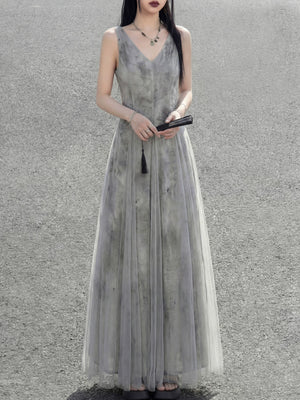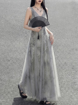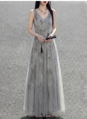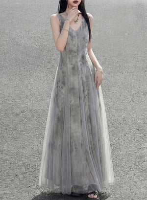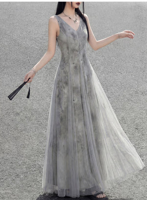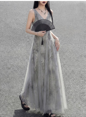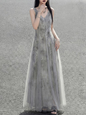 Misty rain ink mesh dress, sleeveless V-neck versatile vacation temperament skirt suspender skirt women