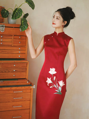 He Huanxi Red Embroidered Cheongsam | Chinese Wedding Toast Dress