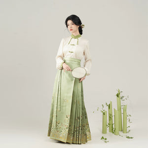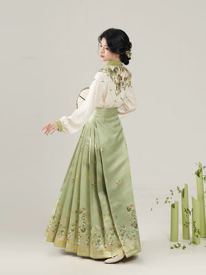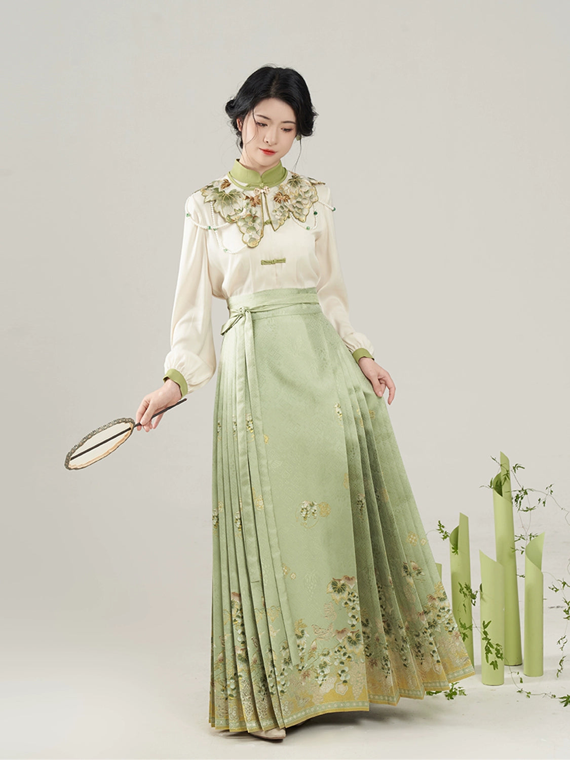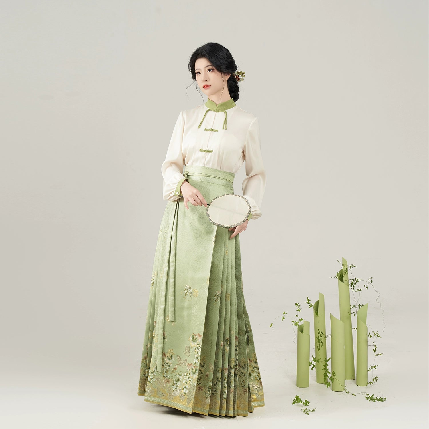 Sunshine Rose – Ming-Style Modern Hanfu Set | Embroidered Cloud-Shoulder Blouse & Floral Ma Mian Skirt