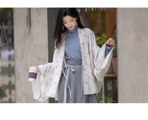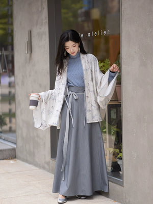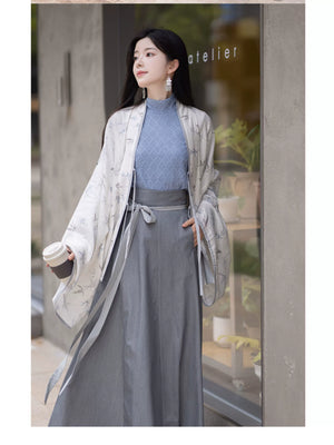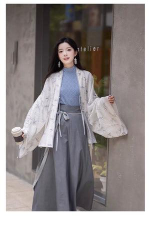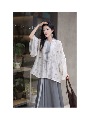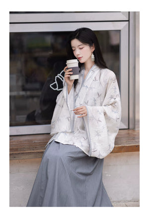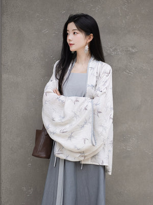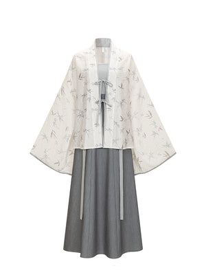 White Dew: Bamboo Shadows & Swallow Whispers – Jin-Style Hanfu Set | Tencel Pleated Robe with Rayon Camisole and Flowing Skirt
